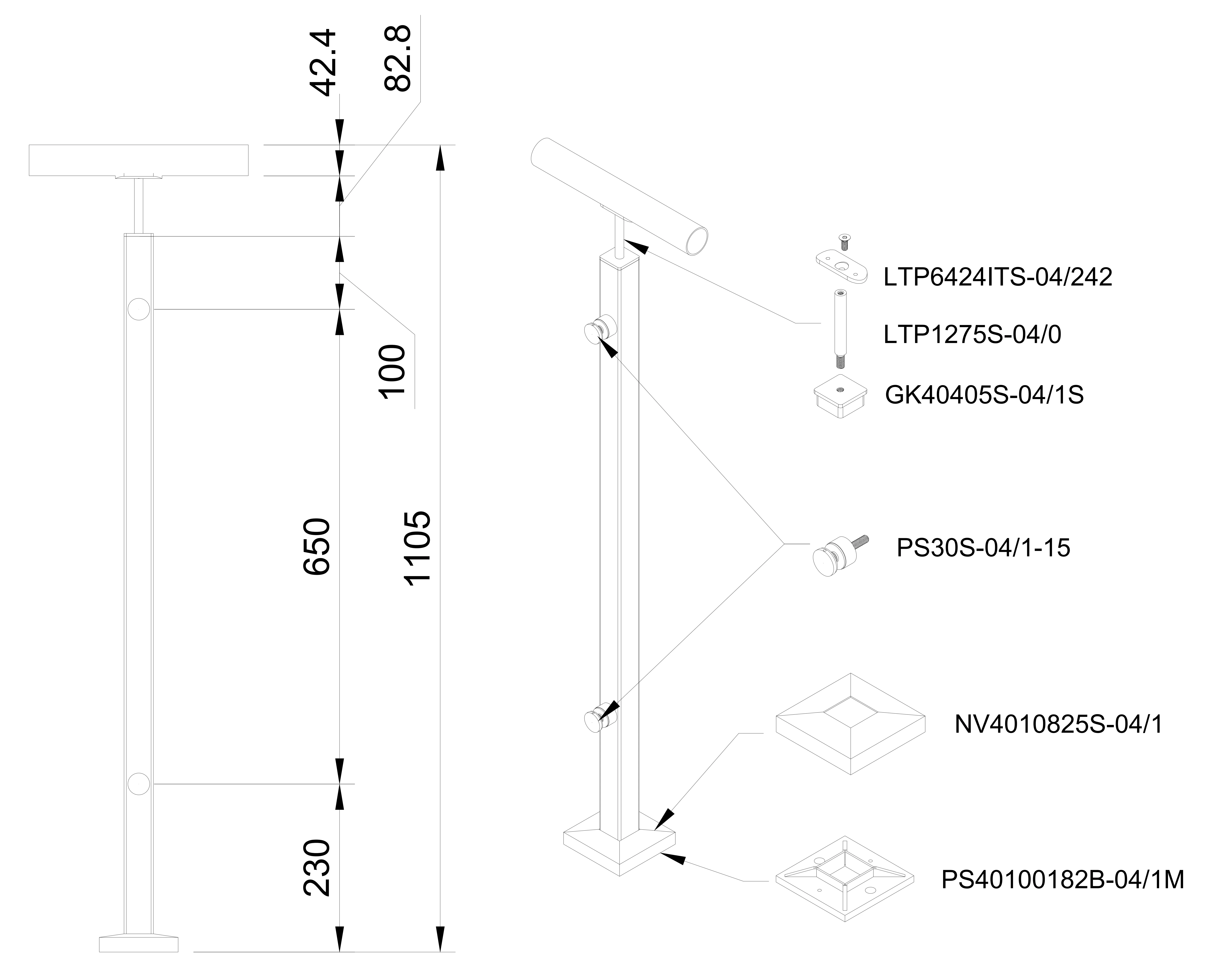 Margu stabiņš ar 2 punktveida stiprinājumiem, horizontālai virsmai, lenterim ø 42.4. H=1060mm, 40x40x2mm, nerūsējošais tērauds, slīpēts, AISI304/316.
