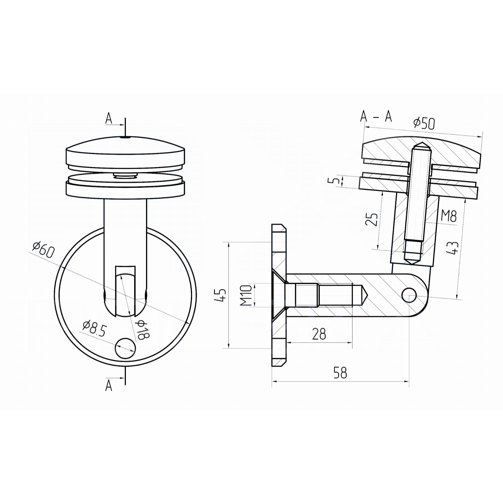 Stikla jumtiņu stiprinājums siena-stikls, d60/d50mm, NT, slīpēts, AISI304/AISI316.