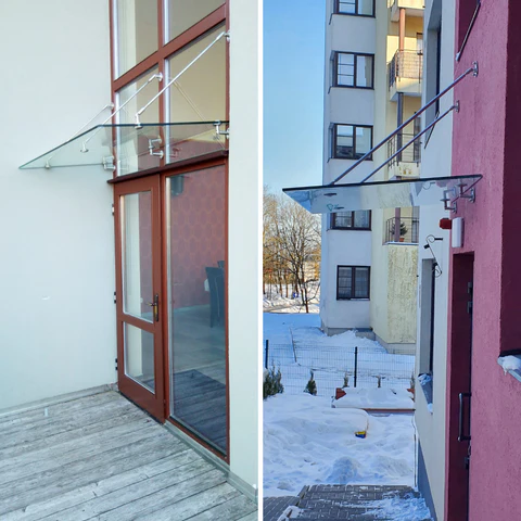 Jumtiņš virs ieejas nav tikai praktiskas konstrukcijas, kas paredzētas aizsardzībai pret nokrišņiem un tiešiem saules stariem. Ražoti no stikla, tie piešķir arī mūsdienīgu eleganci jūsu ieejas zonai.